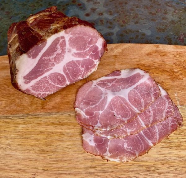 Baleron wieprzowy z Wędzarni Ustrzyki wędzony i parzony. Ten baleron to wędlina wyrabiana ręcznie w kameralnej wędzarni. Baleron marynowany 21 dni. W składzie mięso i naturalne przyprawy, bez konserwantów i bez soli peklującej. Wędzona, pyszna wędlina na kanapki o wyraźnym smaku przypraw i dymienia.
