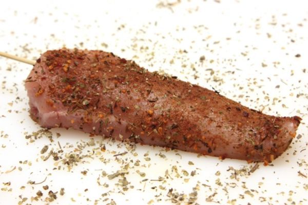 Mięso z piersi kurczaka przygotowane i przyprawione na grilla. Na patyczku ułatwiającym pieczenie i jedzenie. 1 sztuka waży ok 15 dkg.
