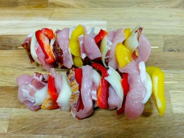 Szaszłyki z czysteko mięsa drobiowego, nieprzyprawionego, z dodatkiem świeżej papryki i cebuli oraz boczku z Kuznocina lub od Dreszlera w zależności od dostępności. Gotowe do grillowania, smażenia lub duszenia w piekarniku.