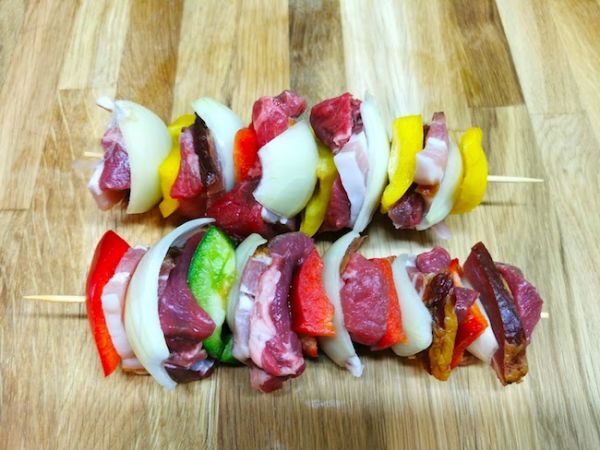 Wołowy szaszłyk z dodatkiem papryki, cebuli i boczku.
