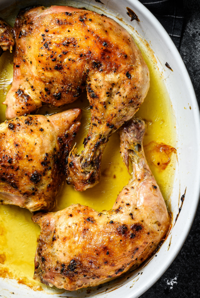 Udka kurczaka pieczone w piecu parowym. Marynowane w ziołach i pieczone na chrupko. Wystarczy odgrzać na parze albo w piekarniku.