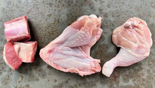 ok. 700-800 g skrzydło indykaok. 300-350 g szponder wołowy / 300-350 g pręgi wołowej (w zależności od dostępności)ok. 250-300 g noga kurczaka.